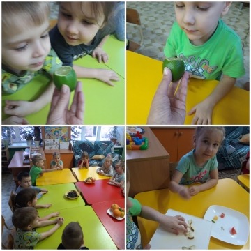 Дети на занятии рассмотрели фрукты, смогли некоторые отличить по запаху, вкусу. Узнали новые фрукты: лайм, гранат.