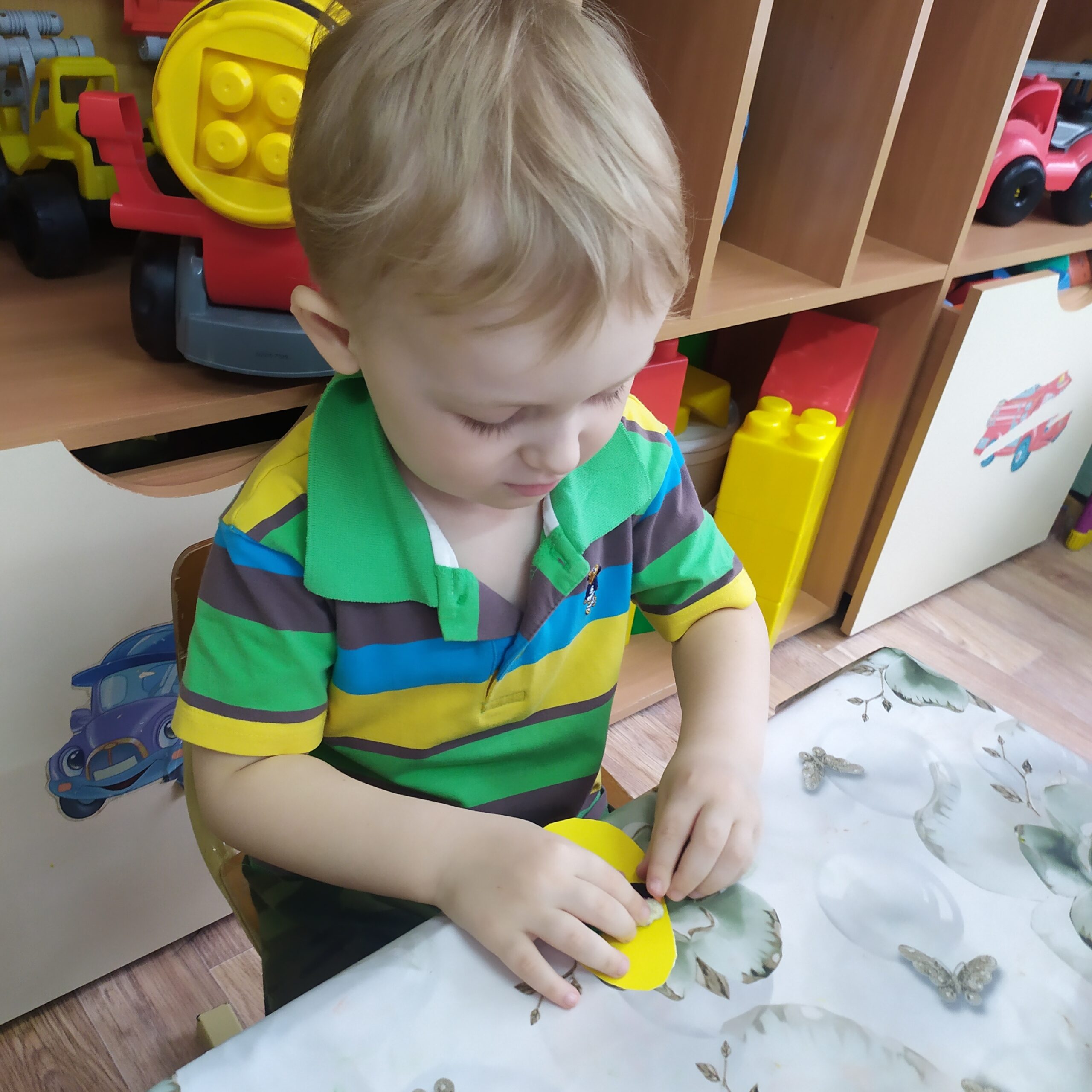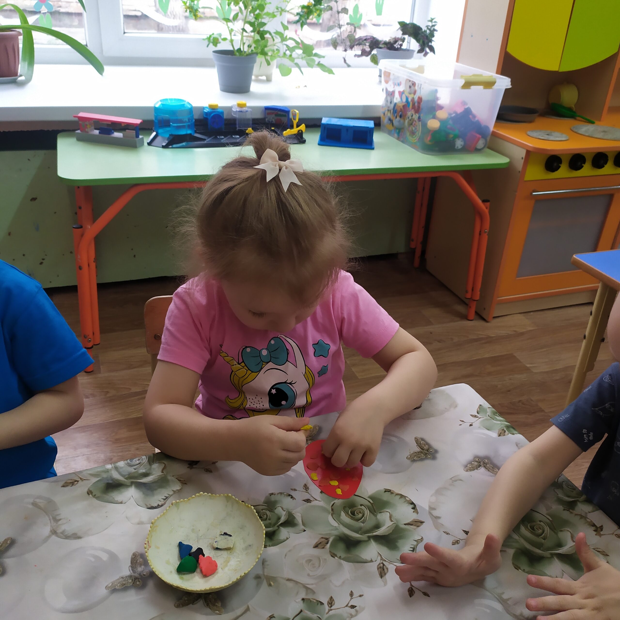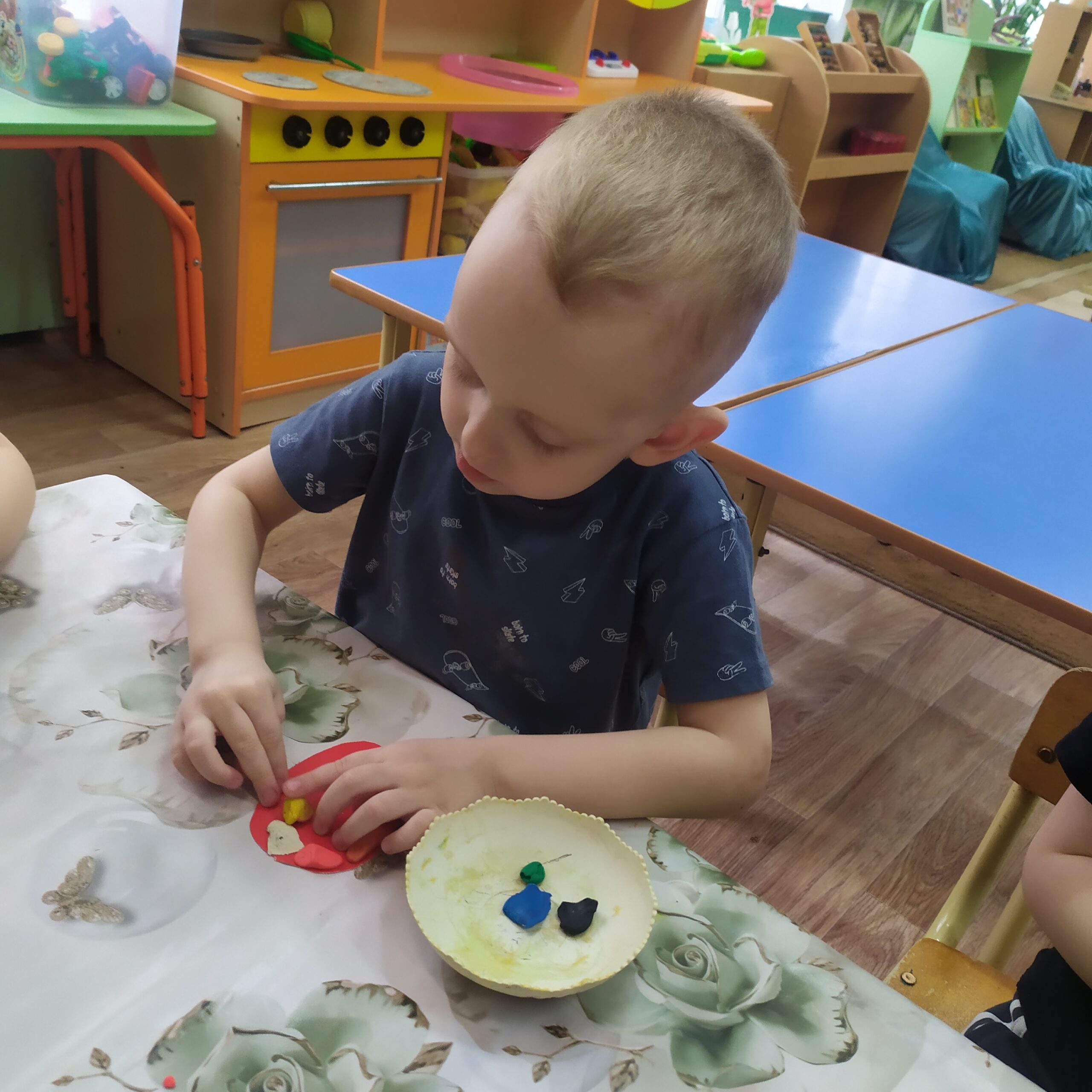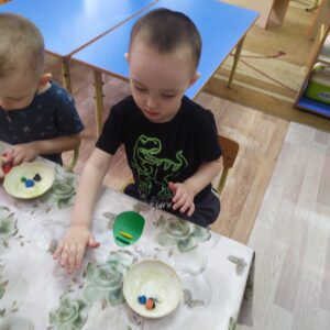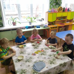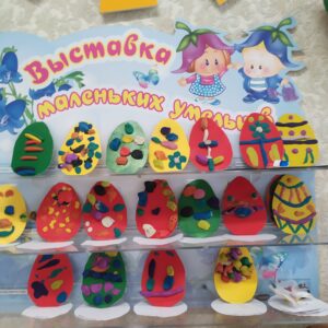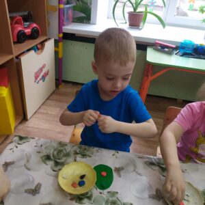 В выходные мы будем встречать светлый Праздник Пасхи. Мы с ребятами тоже решили принять участие, творчески подойдя к процессу. На картонные яйца мы прикрепили пластилиновый декор, работая в технике примазывания. Получилось очень красиво!